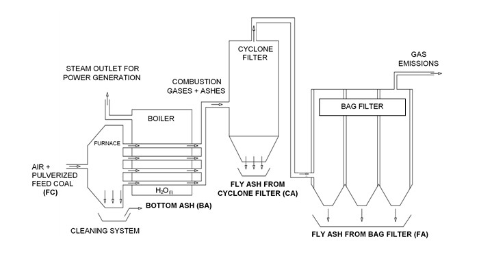 The bottom ash, in the largest particle size, falls down in a container of water on the bottom of the furnace and is withdrawn from the system. Cyclone filter fly ash at intermediate particle size is collected by a cyclone filter. The smallest particle size ashes (fly ashes) are retained by a bag filter after the cyclone filter. Figure 1 summarizes the coal ash retention systems used in FTPP.