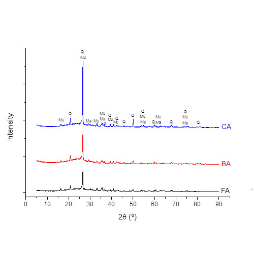 The particle size range for BA sample was between 0.9 and 796 μm. For that sample, the largest particle size (796 μm) is the same as the maximum particle size value of feed coal (shown in section Feed Coal Characterization), indicating that feed carbon particles can be directed to the bottom of the boiler furnace without being burnt during the combustion, thus indicating that the FTPP has low burn efficiency. In addition, BA also has the largest specific area (BET) due to its high unburnt carbon content and, consequently, a higher loss on ignition, as shown before. D90 values show that 90% of the particles of BA, CA and FA samples have diameters smaller than 260.323 μm, 147.704 μm, and 27.786 μm, respectively, which also corroborates to the previous results.