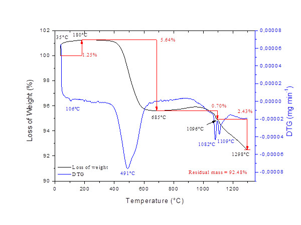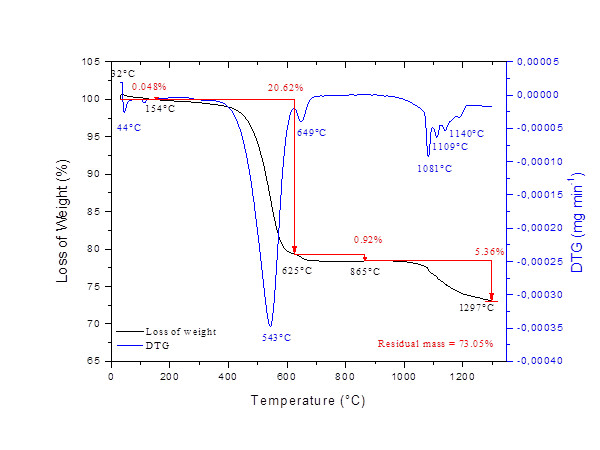 Sample mass variation as a function of temperature was evaluated by Thermo Gravimetric Analysis (TGA) using the TGA thermogravimetric analyzer SDTA 851 - Mettler Toledo. For the feed coal, a mass of 9.3 mg of the previously dried sample was heated using a rate of 10 ° C min-1 in an inert nitrogen atmosphere with a flow of 50 mL min -1, and followed by an isotherm at 1200 ° C in an oxygen atmosphere during 15 min (Fallavena et al., 2013). For the ashes, 7 mg of each sample was previously dried and analyzed under a dynamic nitrogen atmosphere with a flow of 50 mL min-1 and heated until reach 1200 ° C using a rate of 10 ° C min-1.