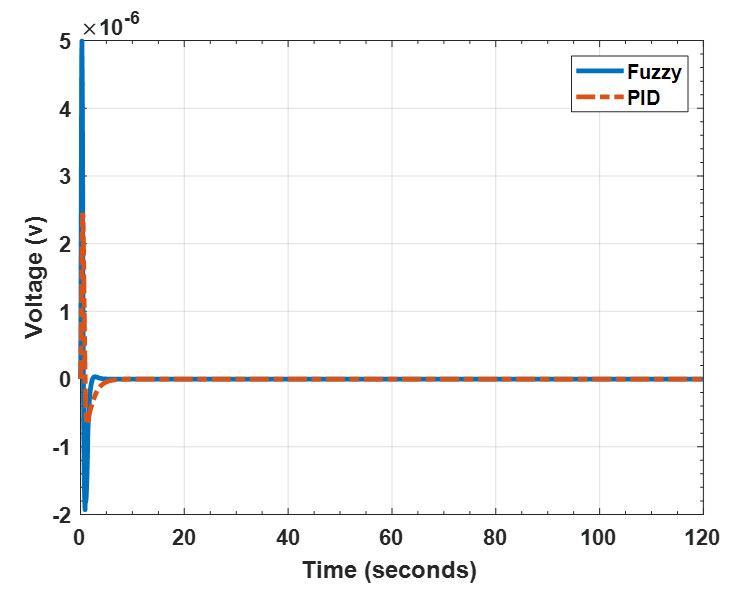 In this section, stabilization control of DRIP using cascade hybrid PID and hybrid Fuzzy-LQR controller has been analysed. Figure 9, Figure 10 and Figure 11 shows the stabilization results for the arm angle, lower pendulum angle and upper pendulum angle respectively. It can be seen that for the arm stabilization, the hybrid Fuzzy-LQR controller outperformed the hybrid PID-LQR in terms of the performance indices considered. This is the same for both upper and lower pendulums. However, the rise time is lower for the hybrid PID-LQR for both upper and lower pendulums. The performance indices considered are rise time, settling time, overshoot, undershoot and steady-state error.