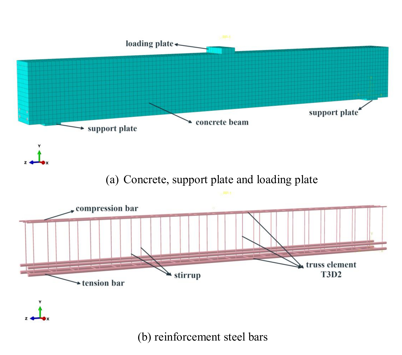 RC beams analysed in this FE study (see Figure 3) were constructed as a discrete model using ABAQUS software [12]. The concrete and the plate for loading as well as for supports in Figure 3.a are modelled using 8-node solid element combined with reduced integration, C3D8R, while both longitudinal steel bars and stirrups in Figure 3.b is modelled with 2-node truss element, T3D2. Several attempts had been successfully done in the past in modelling RC structure elements in ABAQUS using this type of element [13-17]. On the other hand, there was no slip between the concrete and the steel bars reported during the test [11] so the interaction between the steel bar and the concrete in the FE model is assumed perfectly bond.