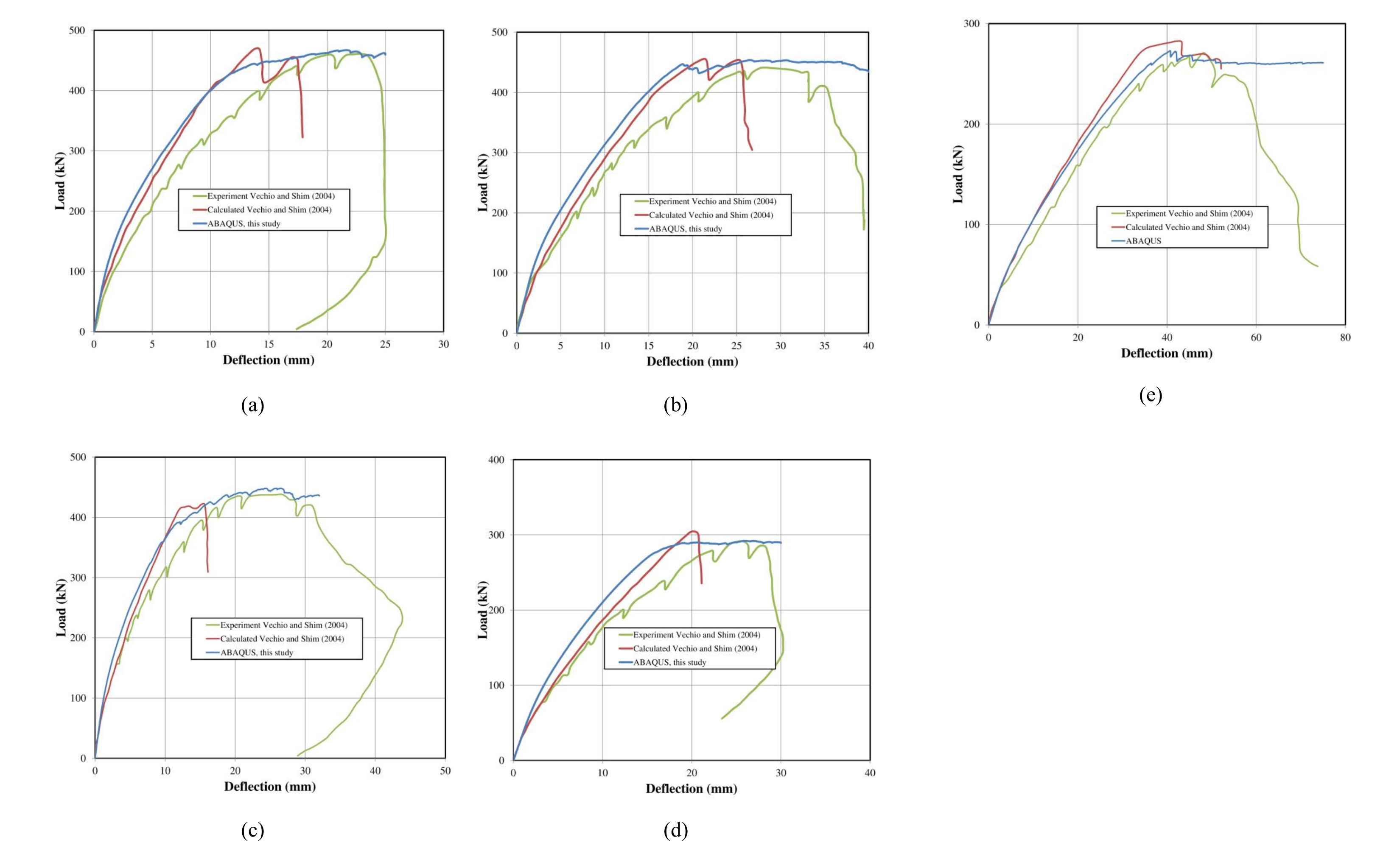Figure 6 compares the load-displacement relationship for all beams obtained from the experiment and 2D analysis with the load-displacement obtained from the 3D FE analysis in this study. The 2D analysis was conducted by Vecchio and Shim [11] by using the DSTM model. DSTM employed a smeared rotating crack approach by considering the compression softening effect in the concrete and divergence of principal stress and principal strain directions.